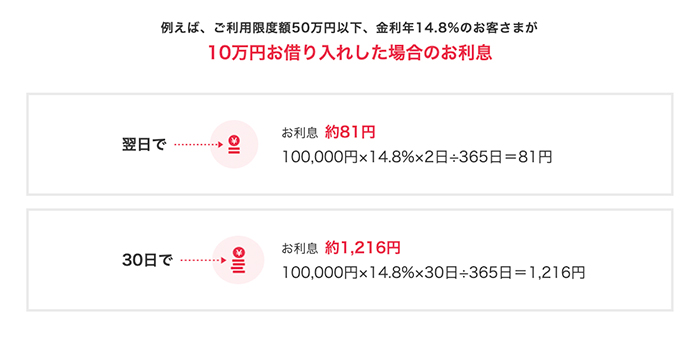 たとえば、ご利用限度額50万円以下、金利年14.8%のお客さまが10万円お借入した場合のお利息は30日で約1,216円※。